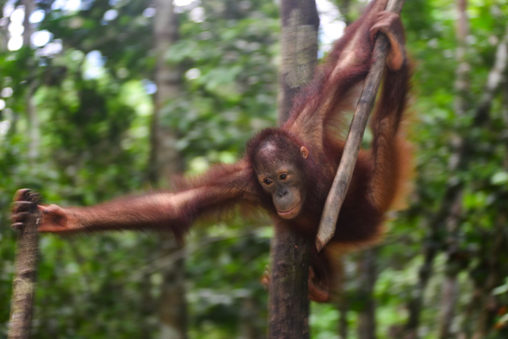 I wake up to the sounds of gibbons and the forest. I lie in my hammock on the soft leaves, listening for a little while to the sounds of the rescue centre as the carers and vets arrive. My bunk mates Devi and Bagus are younger than me, and they sometimes make noise in the morning as they play among the hammocks and leaves. My stomach growls as I start to get hungry for breakfast. I hope we’ll have watermelon!